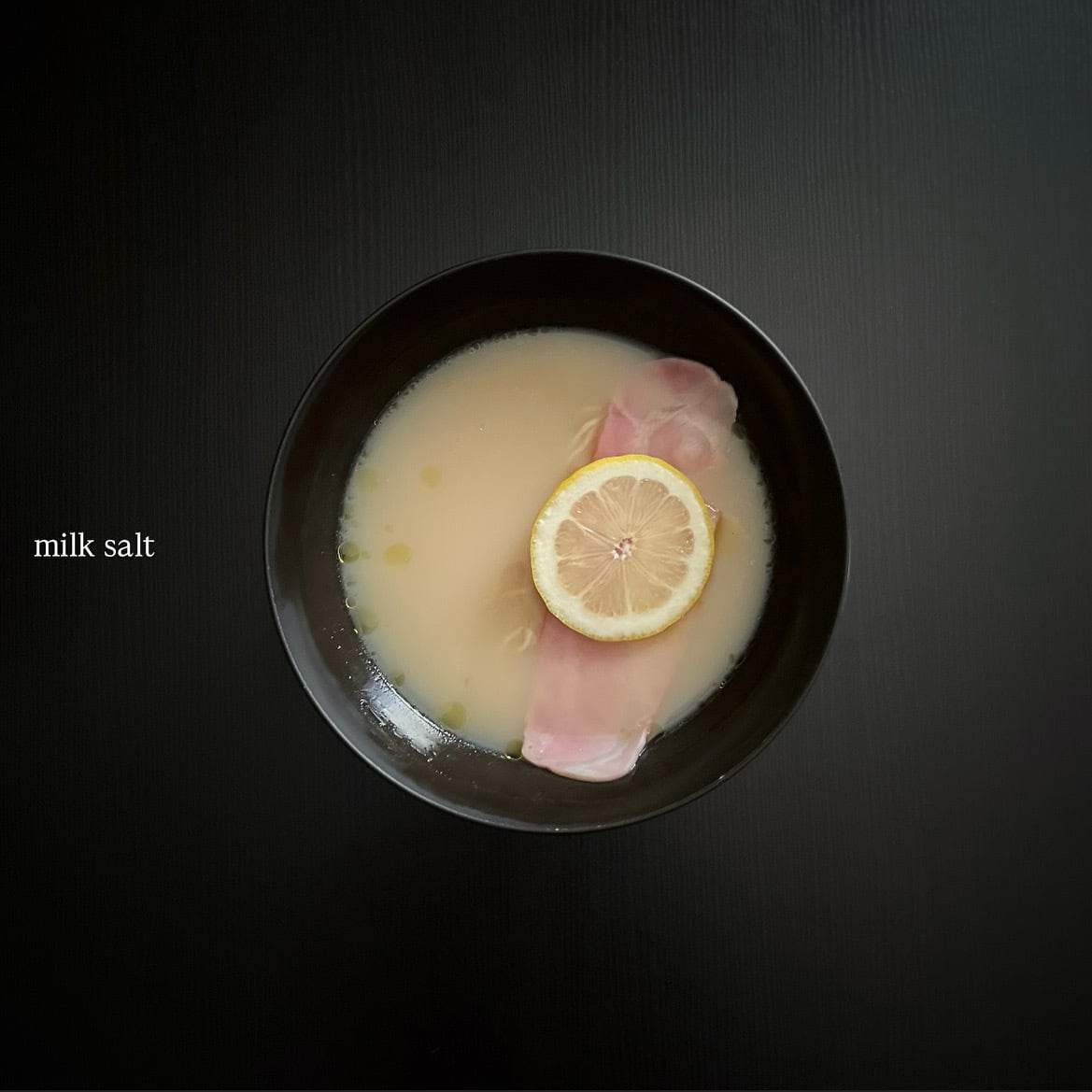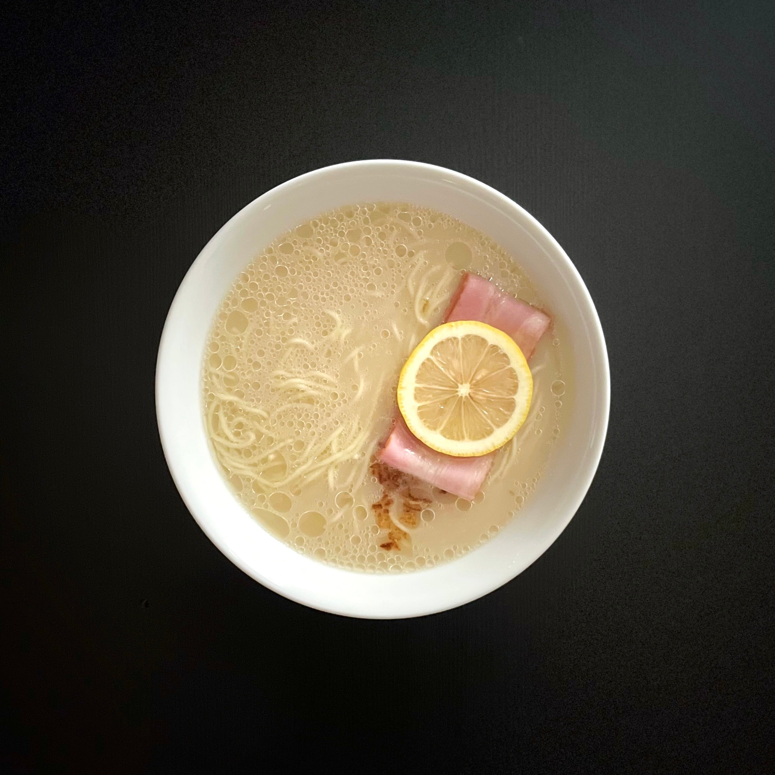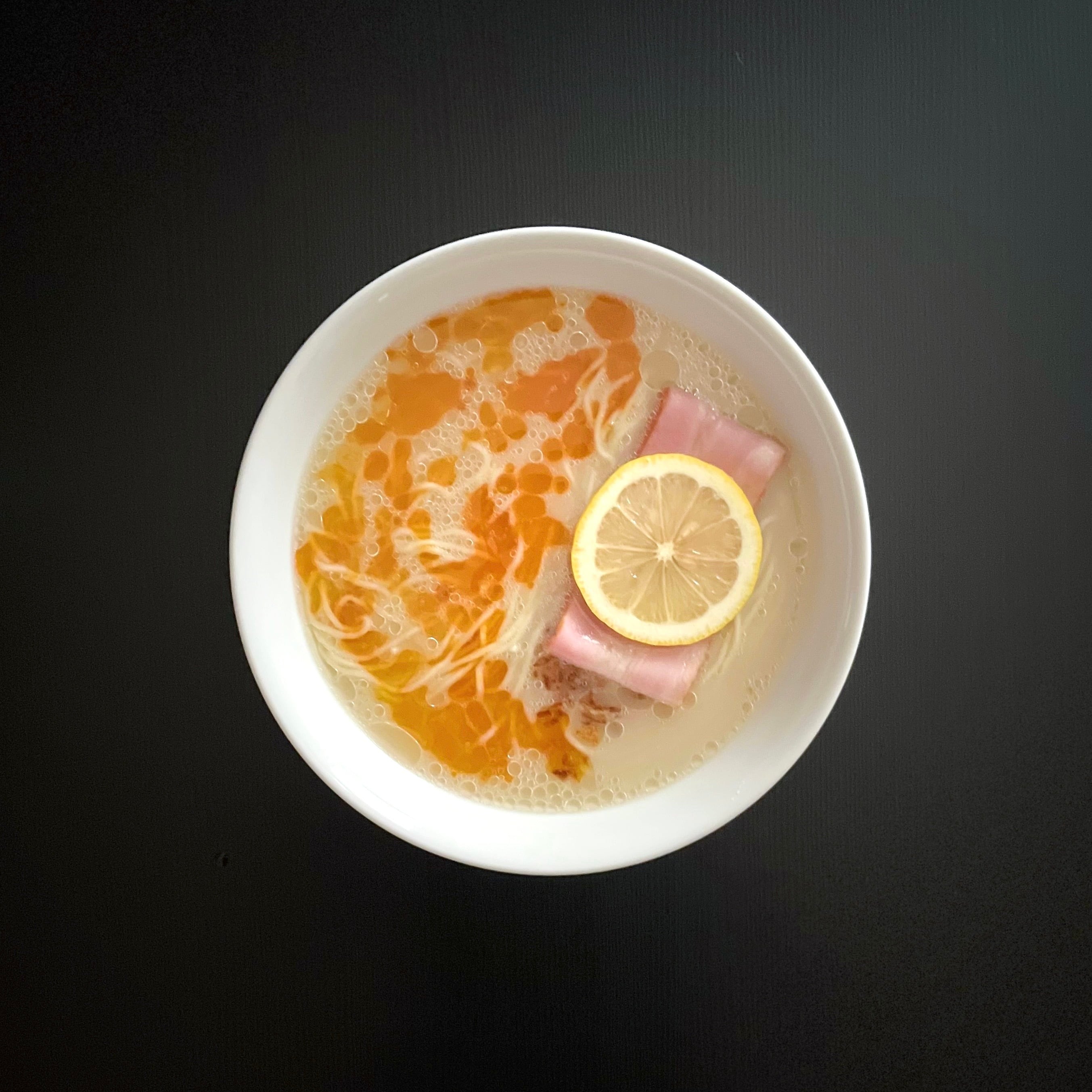 豚肉と香味野菜、魚の節から煮出したシンプルな出汁に、豆乳を使用した塩ダレを合わせたまろやかなスープ。程よい塩味とコク、レモンがほんのり香る優しい一杯。